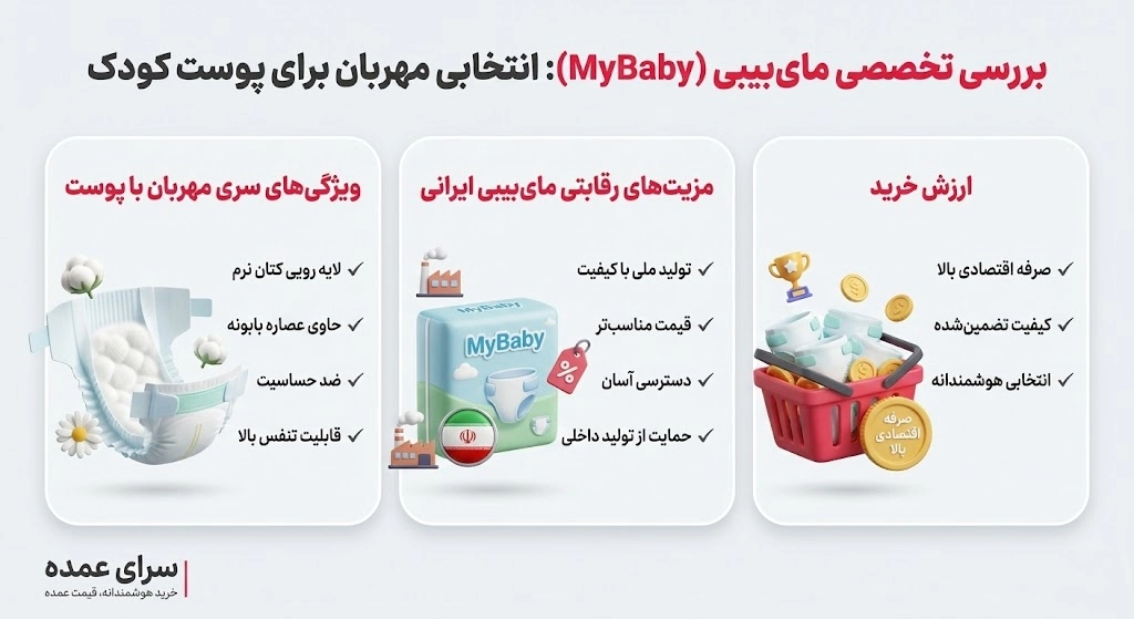 وقتی صحبت از اقتصاد خانواده میشود، مایبیبی معمولاً گزینه خوشقیمتتری نسبت به رقبای خارجی یا تحت لیسانس است. این به معنای کیفیت پایینتر نیست، بلکه به دلیل تولید صددرصد داخلی و حذف هزینههای سربار ارزی، قیمت تمام شده کمتری دارد. برای خانوادههایی که مصرف پوشک بالایی دارند، این اختلاف قیمت در پایان ماه رقم قابل توجهی میشود.