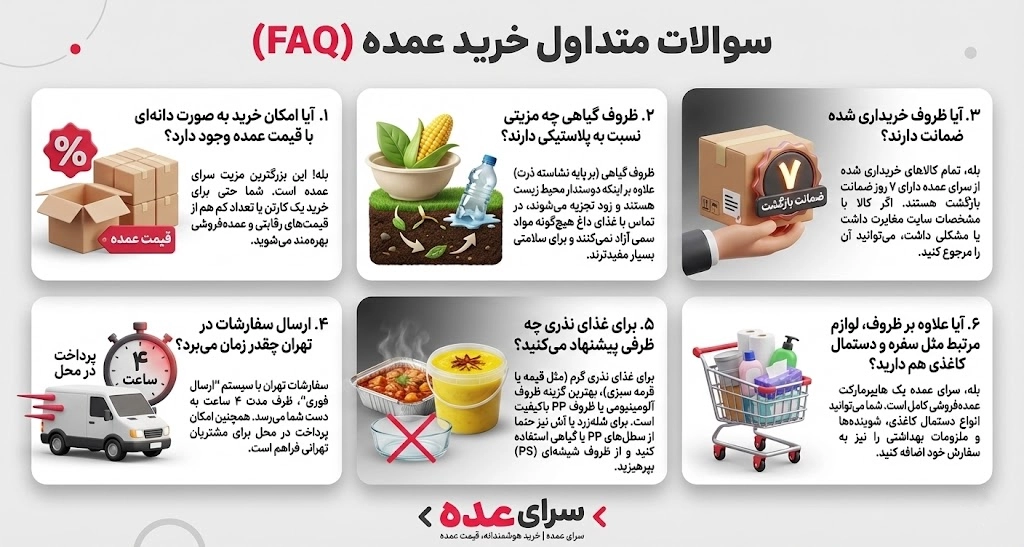 ۳. آیا ظروف خریداری شده ضمانت دارند؟ بله، تمام کالاهای خریداری شده از سرای عمده دارای ۷ روز ضمانت بازگشت هستند. اگر کالا با مشخصات سایت مغایرت داشت یا مشکلی داشت، میتوانید آن را مرجوع کنید.