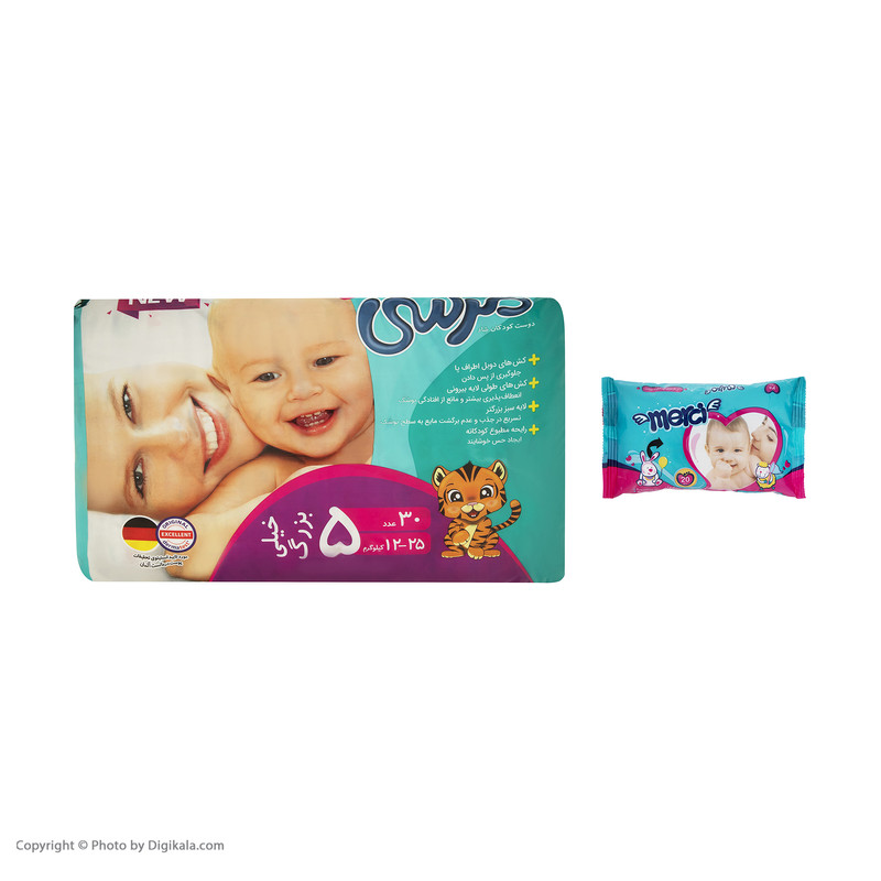 خرید محصول پوشک کامل مرسی سایز 5 (30 عددی) به همراه دستمال مرطوب