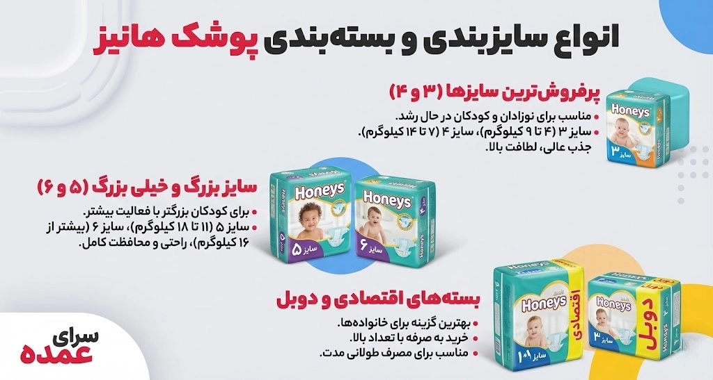 هانیز برای تمام مراحل رشد کودک، از بدو تولد تا زمانی که کودک مستقل میشود، سایزبندی دقیقی ارائه کرده است. در سرای عمده، ما تمامی سایزها را در بستهبندیهای مختلف (نرمال، دوبل، اقتصادی) موجود داریم. انتخاب سایز درست، کلید اصلی جلوگیری از پس دادن نم است. برای دیدن تمام مدلهای پوشک از برندهای مختلف، میتوانید به صفحه اصلی پوشک مراجعه کنید.
