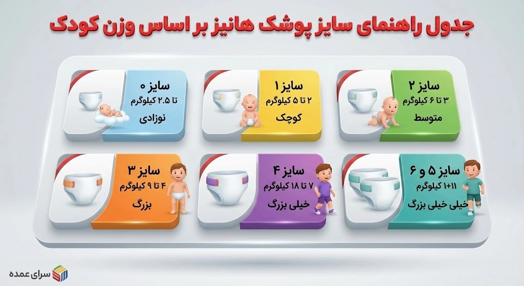 جدول راهنمای سایز پوشک هانیز بر اساس وزن کودک