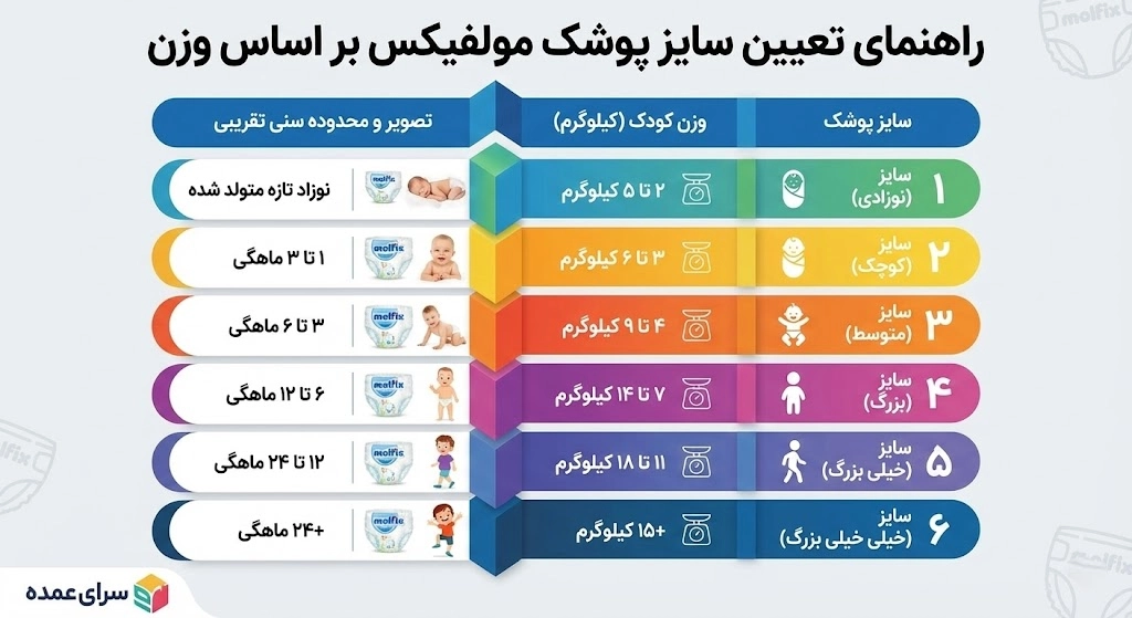 جدول راهنمای تعیین سایز پوشک مولفیکس بر اساس وزن