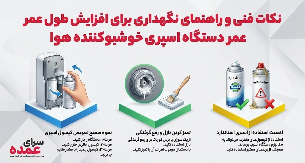 گاهی اوقات ذرات معلق عطر در خروجی نازل خشک شده و باعث گرفتگی میشوند. این موضوع به موتور فشار میآورد. هر بار که کپسول را عوض میکنید، با یک گوشپاککن آغشته به الکل، حفره خروجی دستگاه را تمیز کنید. این کار ساده عمر دستگاه شما را دوبرابر میکند.